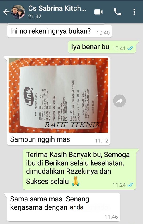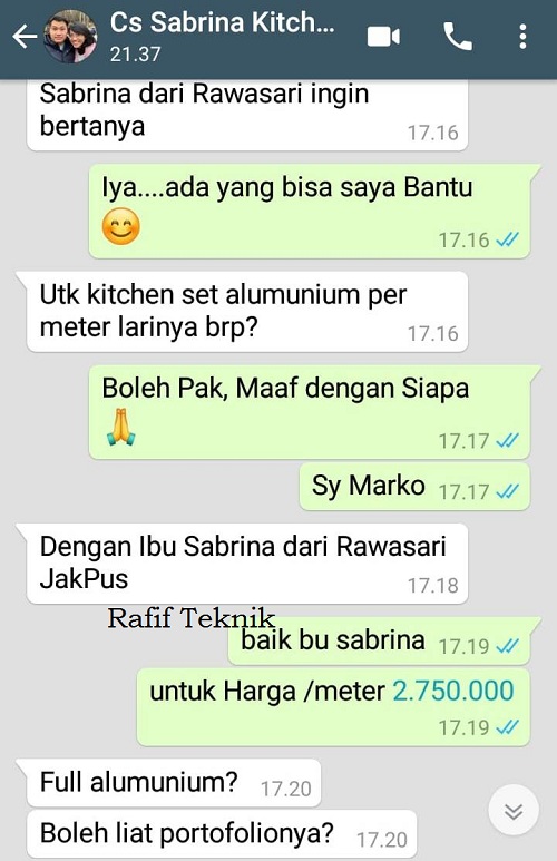 Rafif Teknik memang sudah menyediakan beberapa contoh desain maupun produk yang sudah jadi. Hal itu bisa menjadi gambaran bagi konsumen untuk membeli set kitchen. Tetapi juga tetap membuka layanan custom bagi konsumen yang memang sudah memiliki desain tersendiri. Bahkan, dengan begitu memudahkan pihak Rafif dalam proses pembuatan.